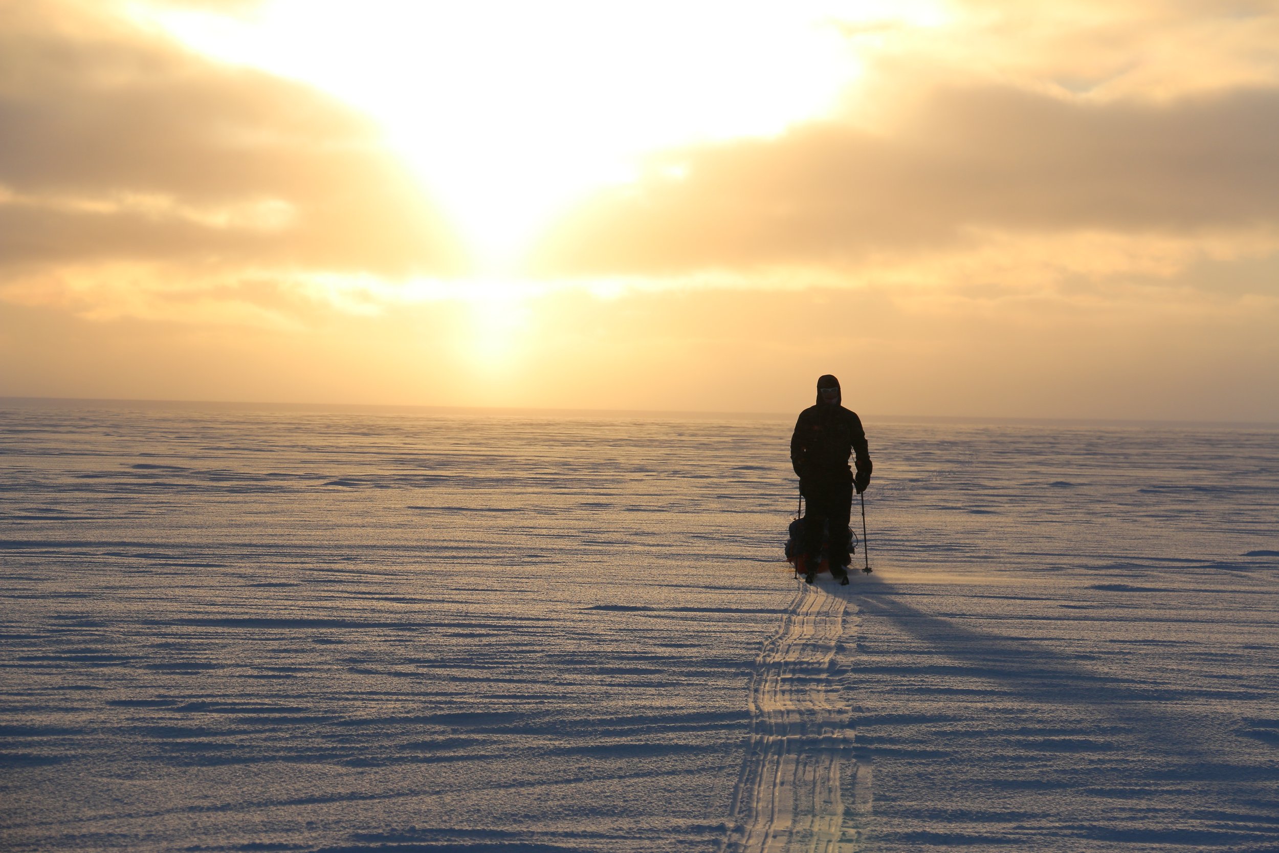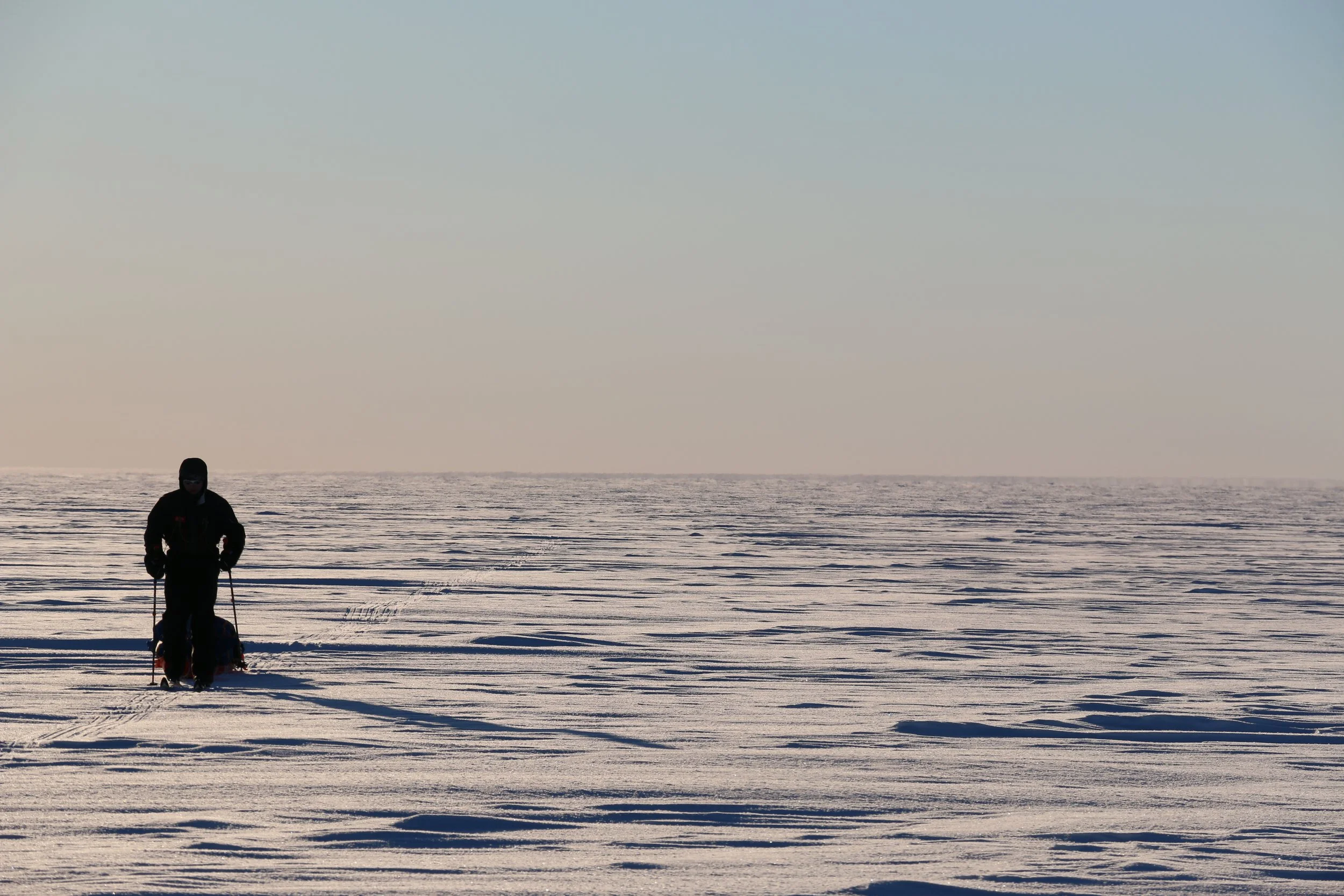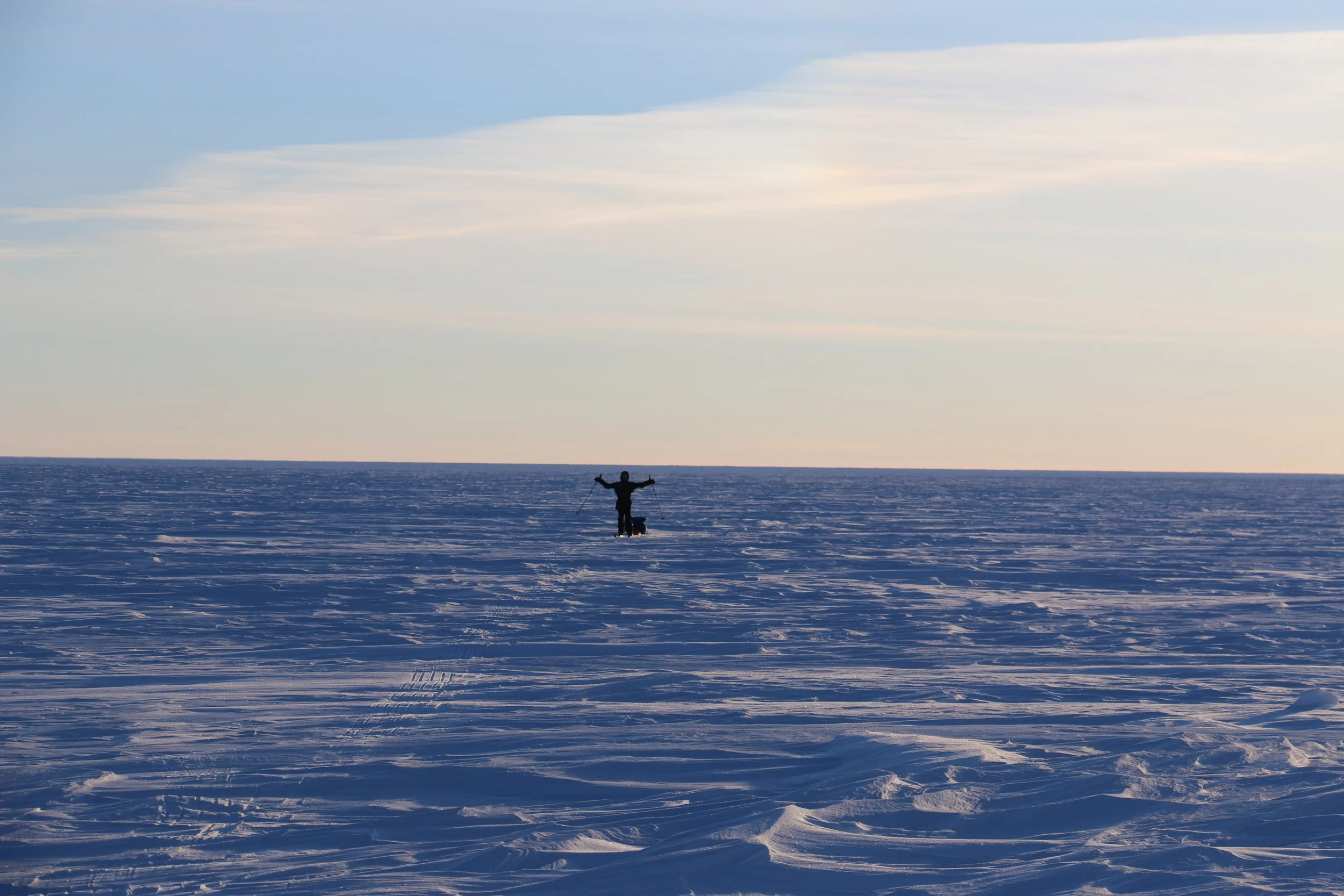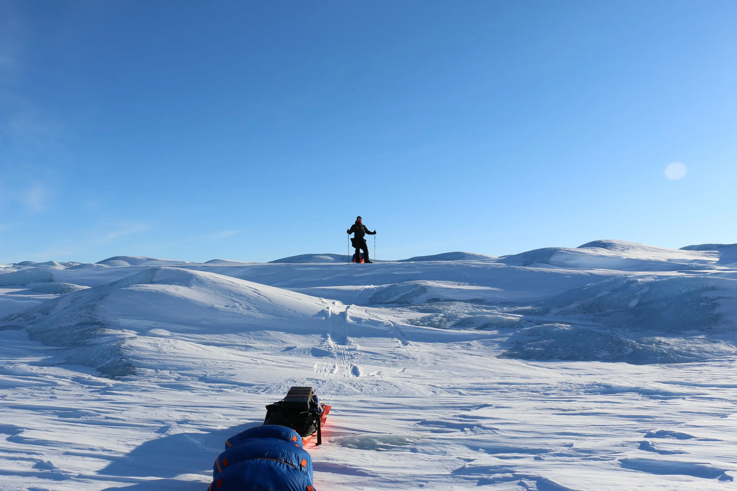 Vi går videre fra DYE II og mot høyeste punkt av innlandsisen. Høyeste punkt er på ca. 2500 moh, men vi merker omtrent like lite til “nedoverbakken” som vi gjør til oppoverbakken. Terrenget er fascinerende flatt, og på stille dager er stillheten helt fullkommen.