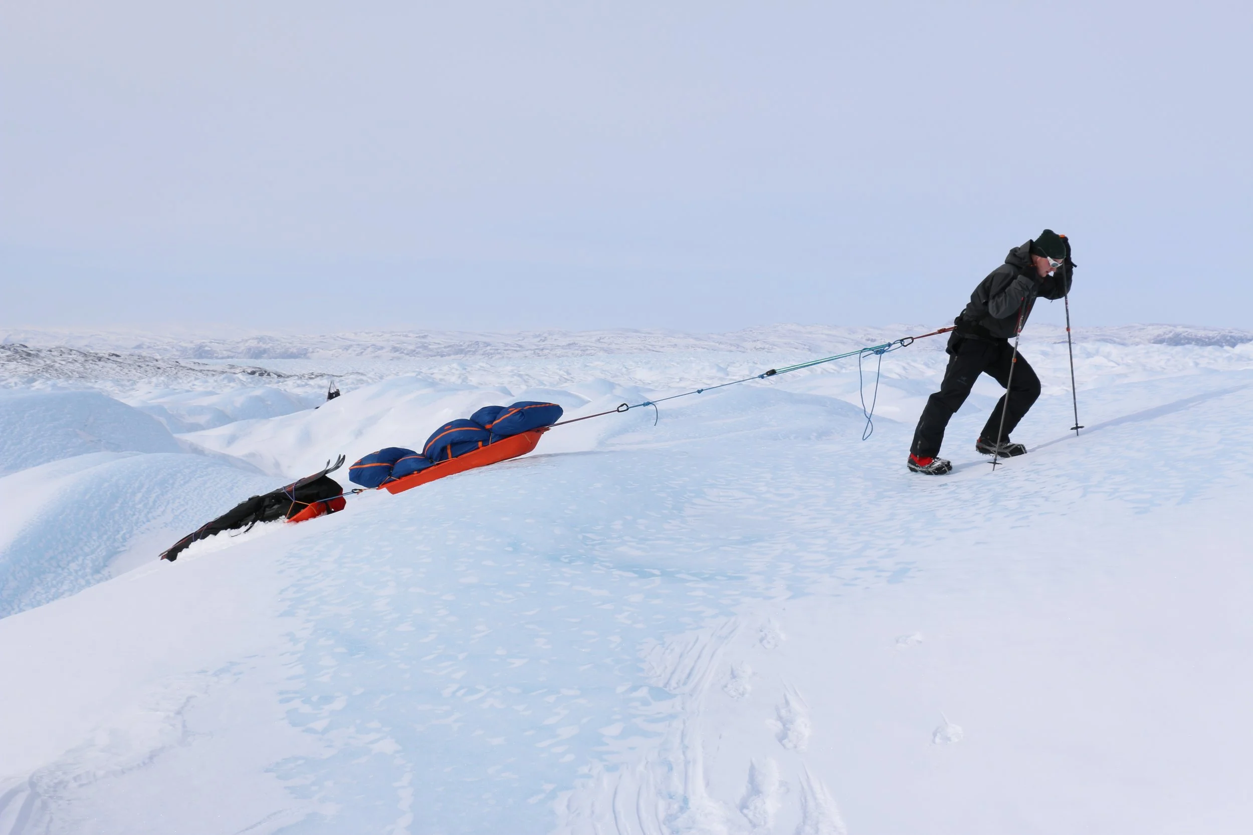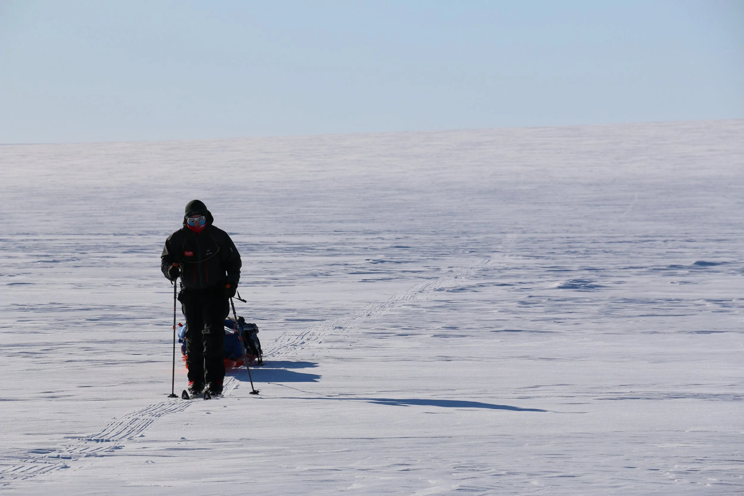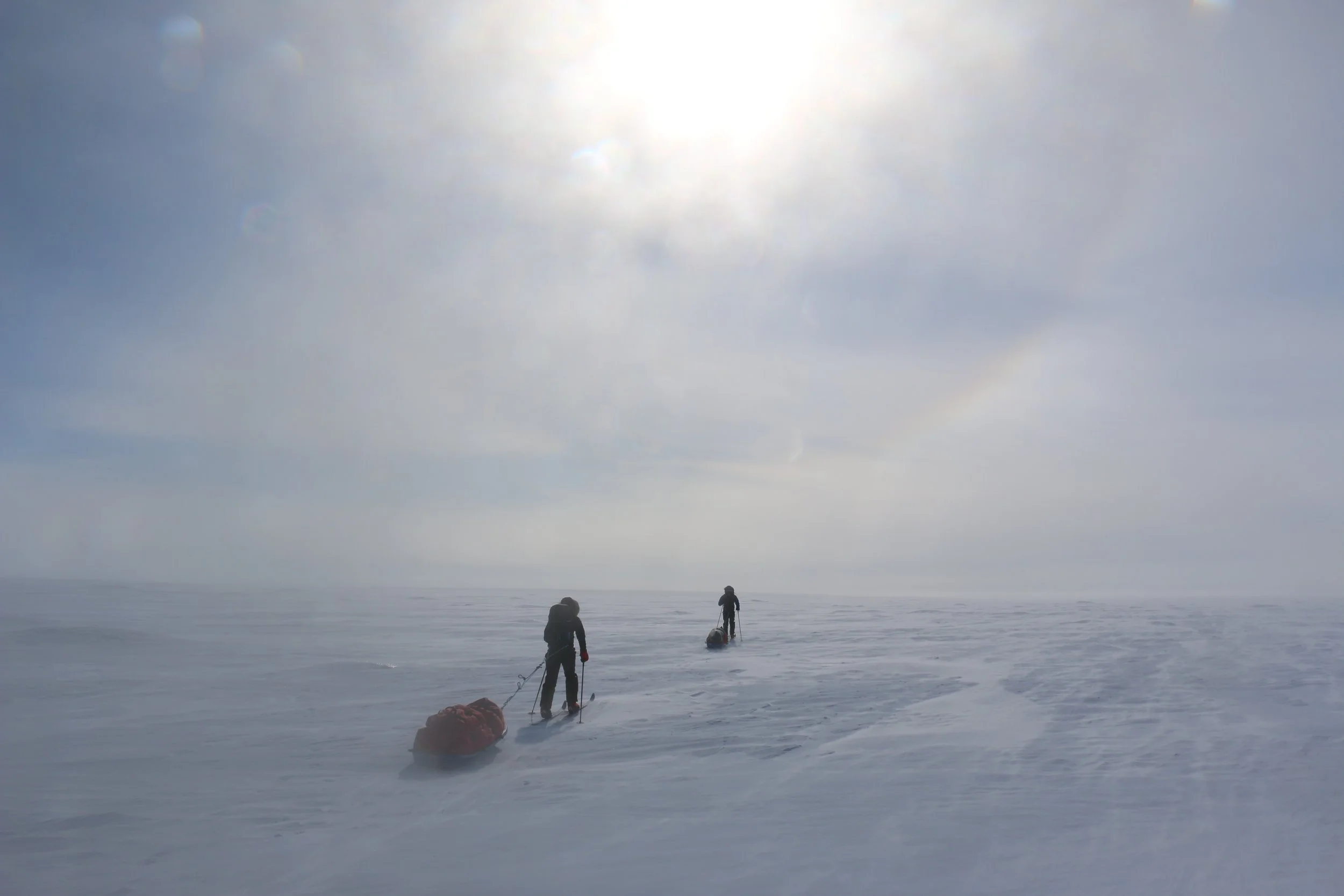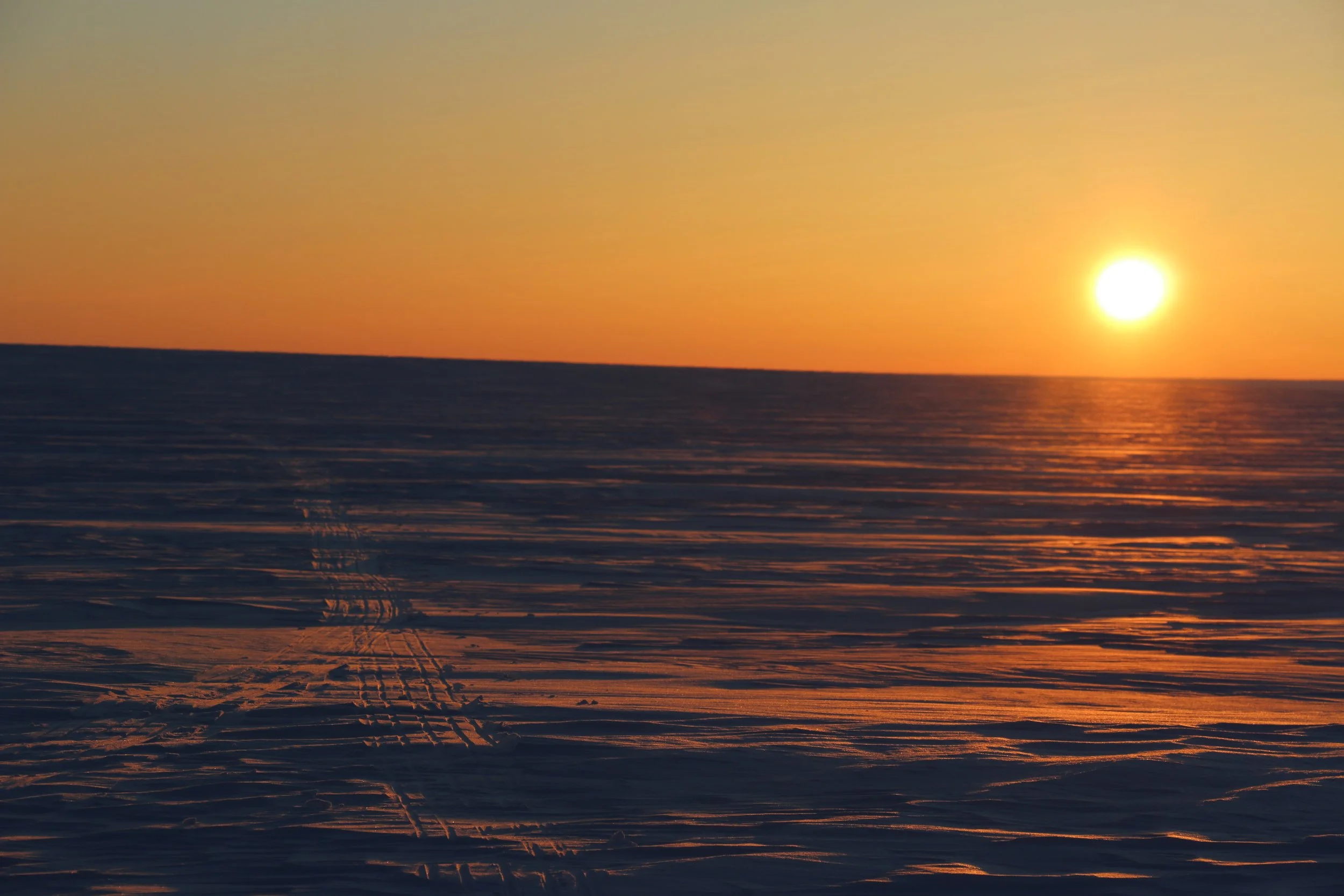 Vi går videre fra DYE II og mot høyeste punkt av innlandsisen. Høyeste punkt er på ca. 2500 moh, men vi merker omtrent like lite til “nedoverbakken” som vi gjør til oppoverbakken. Terrenget er fascinerende flatt, og på stille dager er stillheten helt fullkommen.