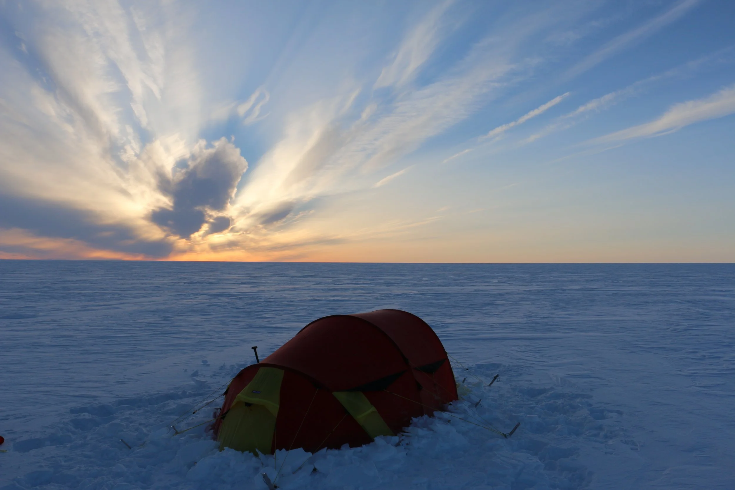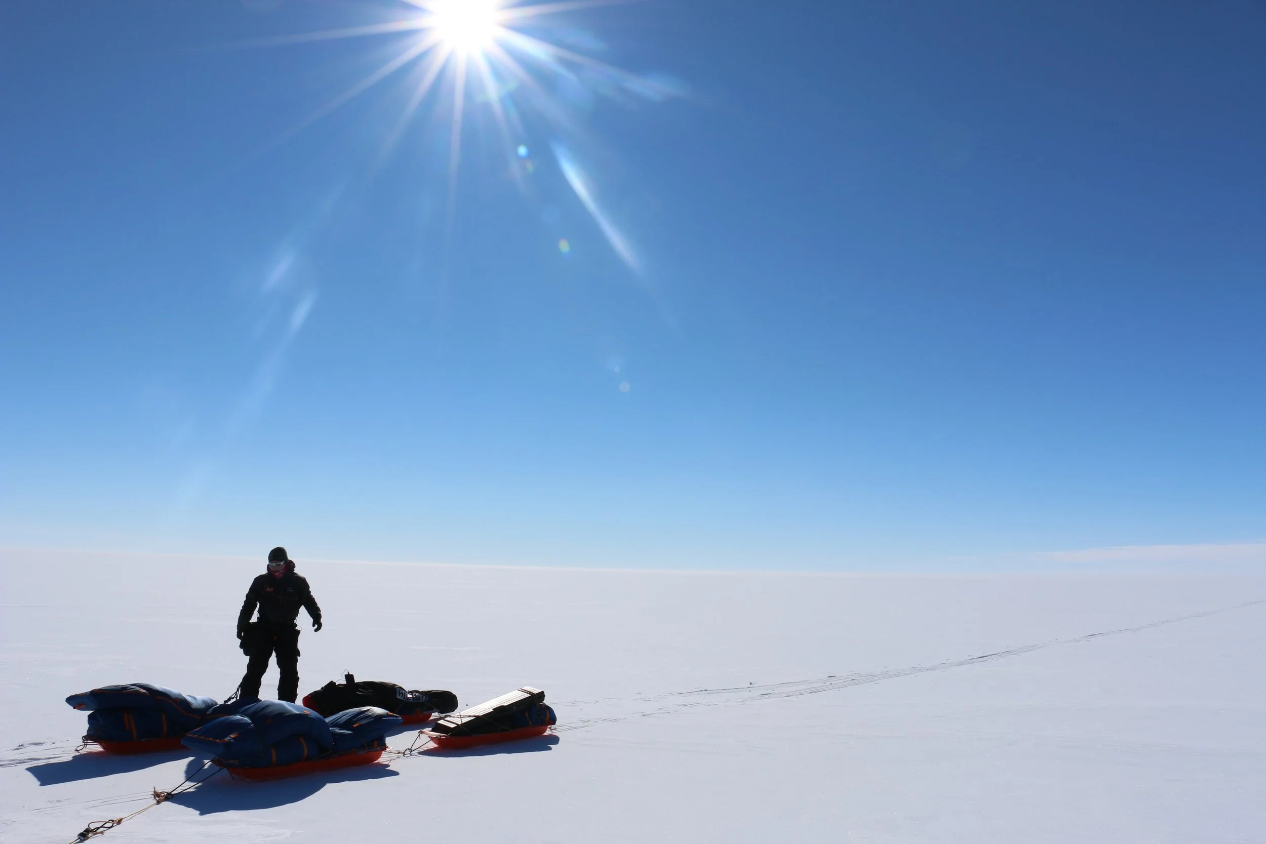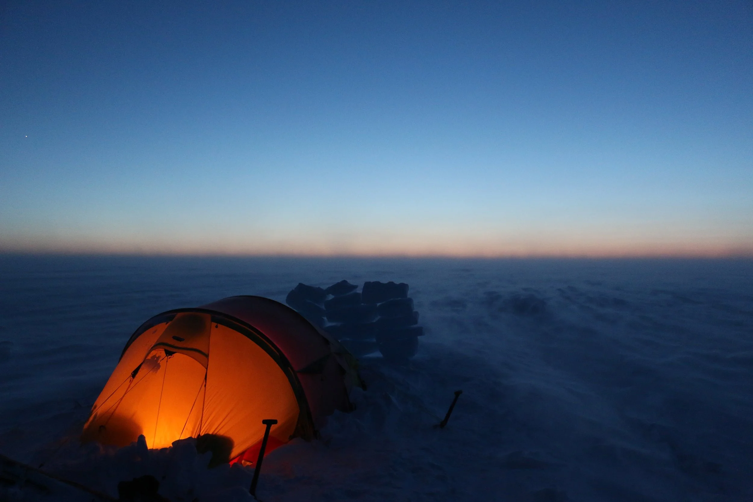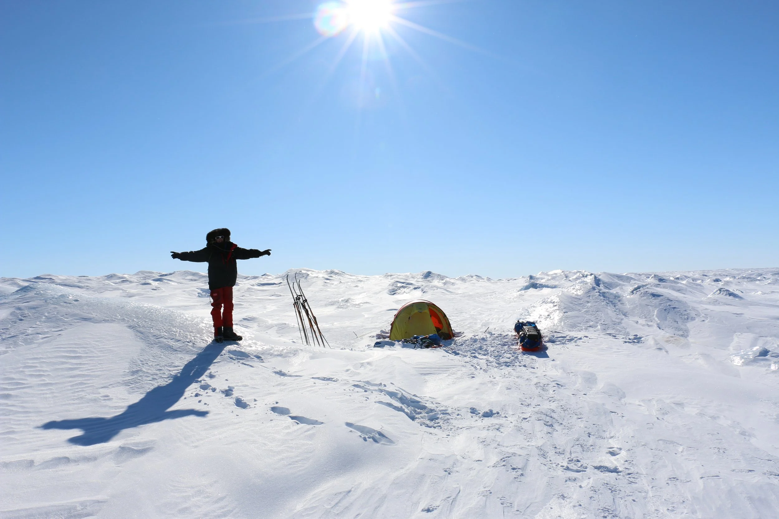 Vi går videre fra DYE II og mot høyeste punkt av innlandsisen. Høyeste punkt er på ca. 2500 moh, men vi merker omtrent like lite til “nedoverbakken” som vi gjør til oppoverbakken. Terrenget er fascinerende flatt, og på stille dager er stillheten helt fullkommen.